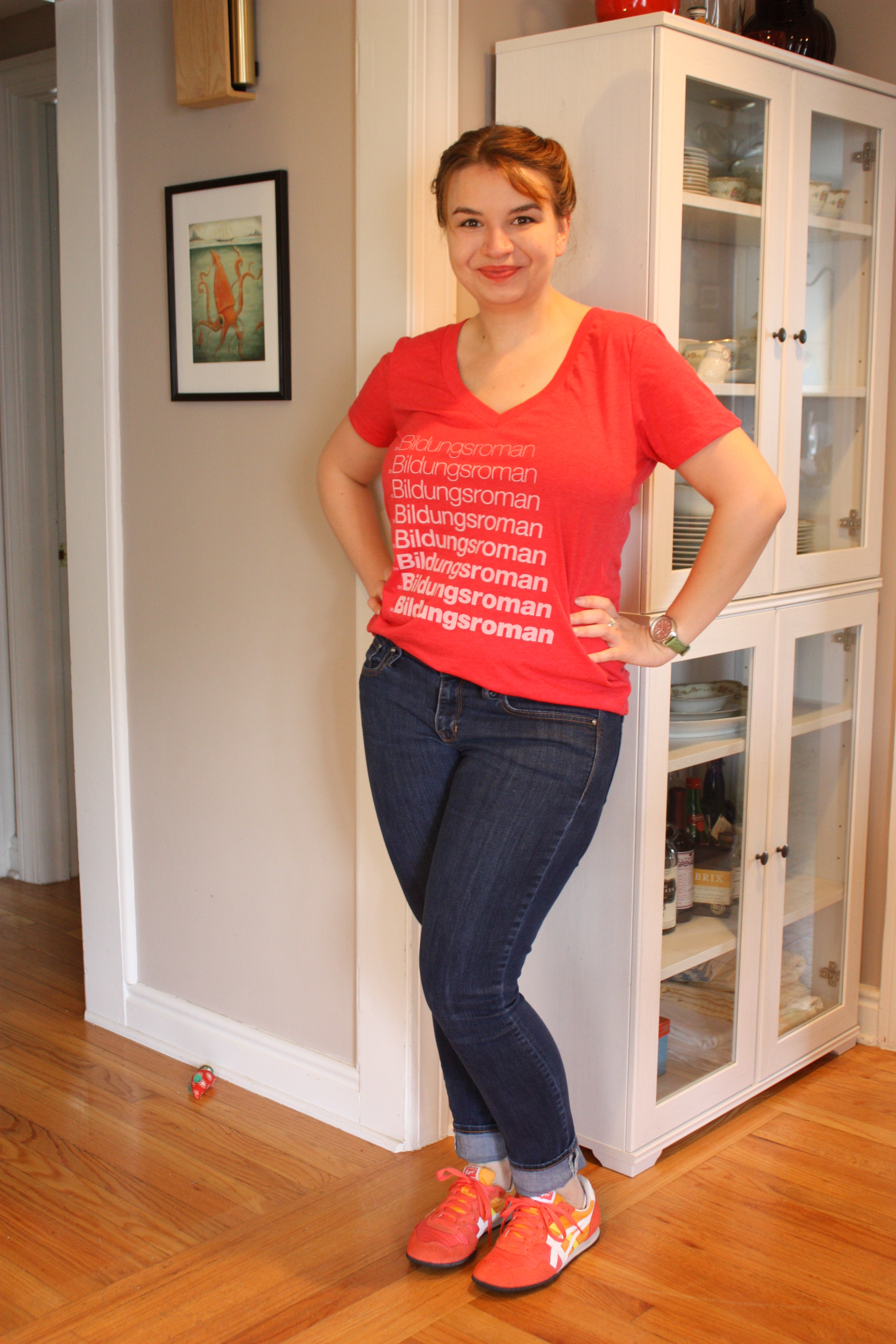 B and I were planning on hitting up a local museum today, so I decided to have an extra-comfy, dressed down day, complete with this tee-shirt from Out of Print Clothing (“OoP”). I really love this company for two reasons. First, everything they sell is literary and I’m a huge bibliophile (I had a friend who once tried to index all of my books for me; when he last worked on this endeavor, at least four years ago, I had well over 600 texts). Second, for every product sold, OoP donates one book through Books for Africa to a community that doesn’t have access such things.